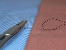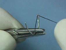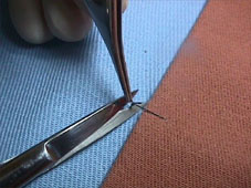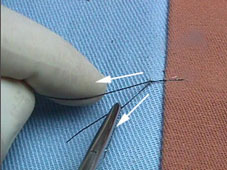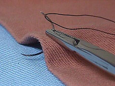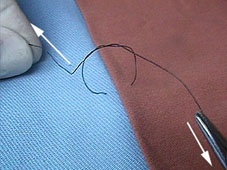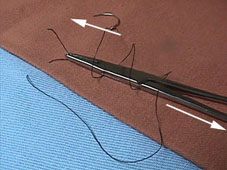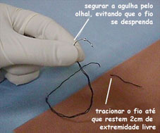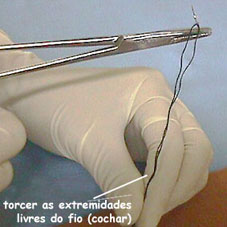 | 6.6 Tracionar as extremidades da linha, de tal sorte a liberar as voltas da linha dadas no porta-agulhas, até que o nó se complete. Agora as duas pontas da linha deverão ser tracionadas em conjunto em direção a uma das bordas da "ferida". |