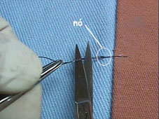 | 6.7 Repetir essa operação mais uma vez, de modo que dois nós se sobreponham, evitando assim o seu desatamento. Com isso, você concluiu um ponto de sutura. Devemos ressaltar que com fios de seda ou de categute deverão ser dados, no mínimo, três nós, devido à facilidade de desatamento desses fios. |