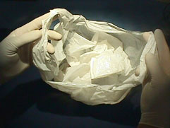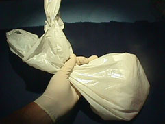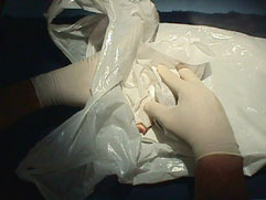 4. Embalagem final Todo o material (perna de frango, campo cirúrgico, folha de papel-toalha, linhas de sutura usadas, agulhas descartáveis, lâminas, gazes etc.) deverá ser embalado cuidadosamente com o saco plástico que está servindo de apoio, revertendo-o a partir da abertura e envolvendo todo o conjunto de dejetos, conforme figura.